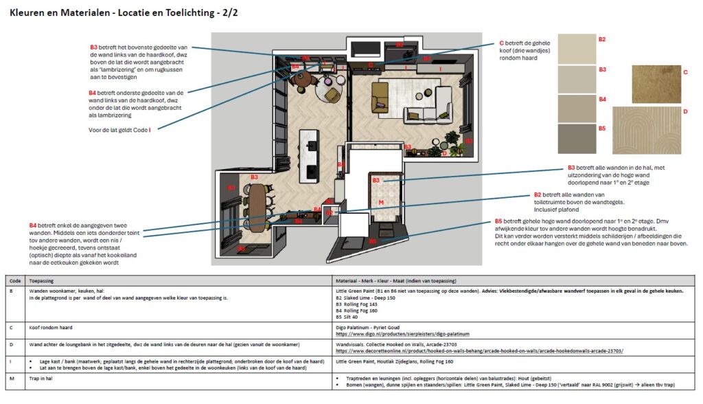 Betreft een groot gezinshuis, jaren ’70. De bewoners wensten een interieur met een rustige, verrassende basis, met toevoeging van kleuren en prints en gebruik van natuurlijke materialen (warm hout), zachte (en gekleurde) stoffen en kleden. Ze wilden graag eenheid in het interieur en verbinding van de verschillende ruimten. Een comfortabel en functioneel interieur is neergezet, rekening houdend met de leefstijl en levensfase van de bewoners en met de jaren ’70 stijl en uitstraling van de woning. De uitvoering van het interieurplan is ‘in progress’.